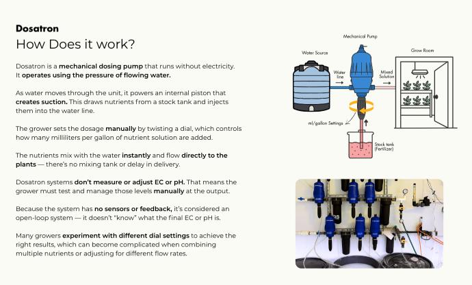 Dosatron is a mechanical, scalable solution best for large commercial operations. It’s effective when your nutrient recipe rarely changes and staff are available to manually monitor pH and EC.